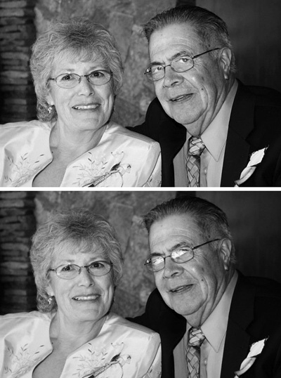 I was asked to remove the photo flash from the eyeglasses in the bottom photo. Using Photoshop and plenty of my own artistic drawing ability, I was able to remove the flash and re-construct the eyes. I was proud to fix this photo and to create a long lasting and memorable image.